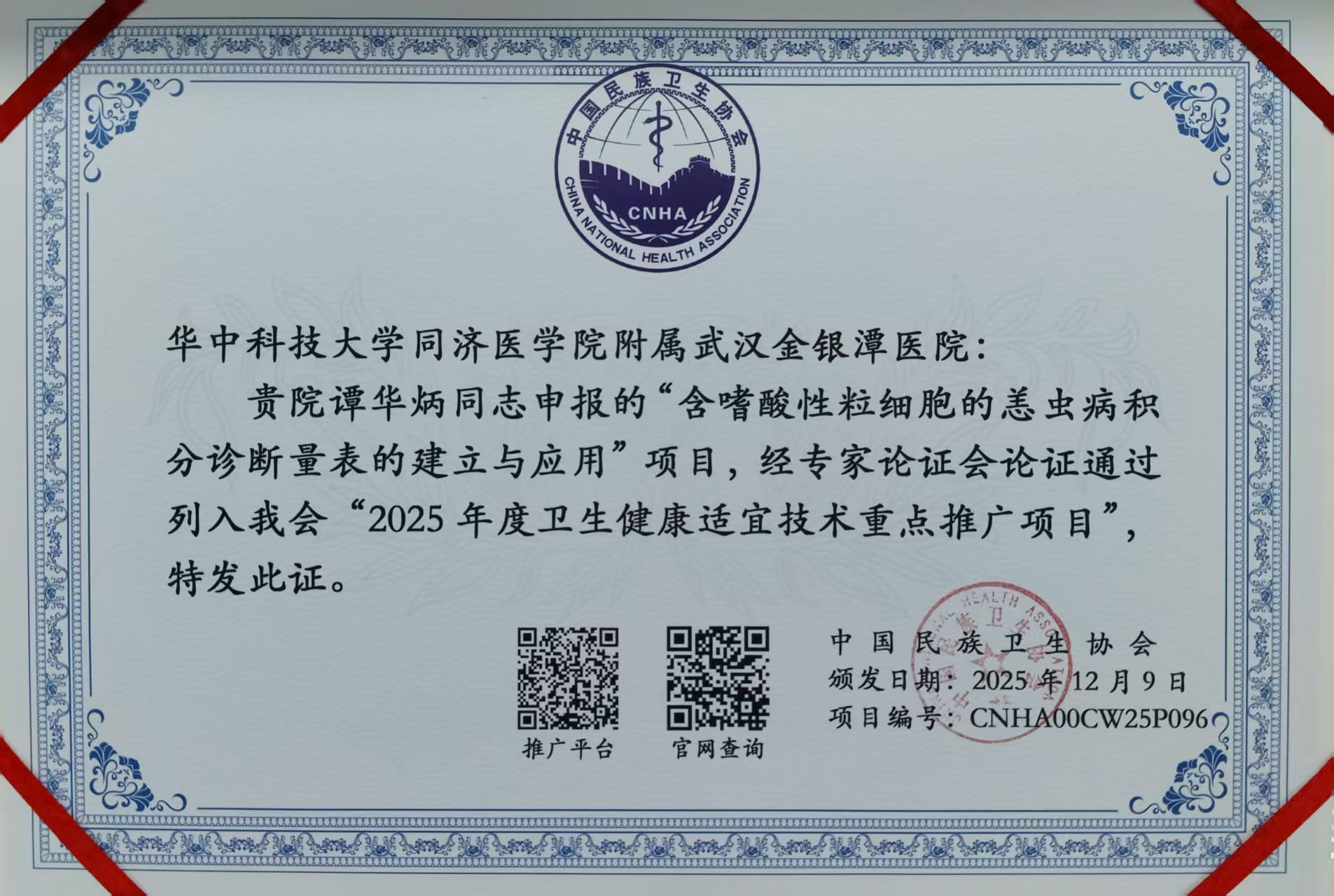 12月26日,武汉市金银潭医院普通内科(全科医学科)主任谭华炳教授收到中国民族卫生协会通知,其研究成果《含嗜酸性粒细胞的恙虫病积分诊断量表的建立与应用》被列入“2025年卫生健康适宜技术重点推广项目,成果的实用性、可推广性得到中国民族卫生协会的认同。