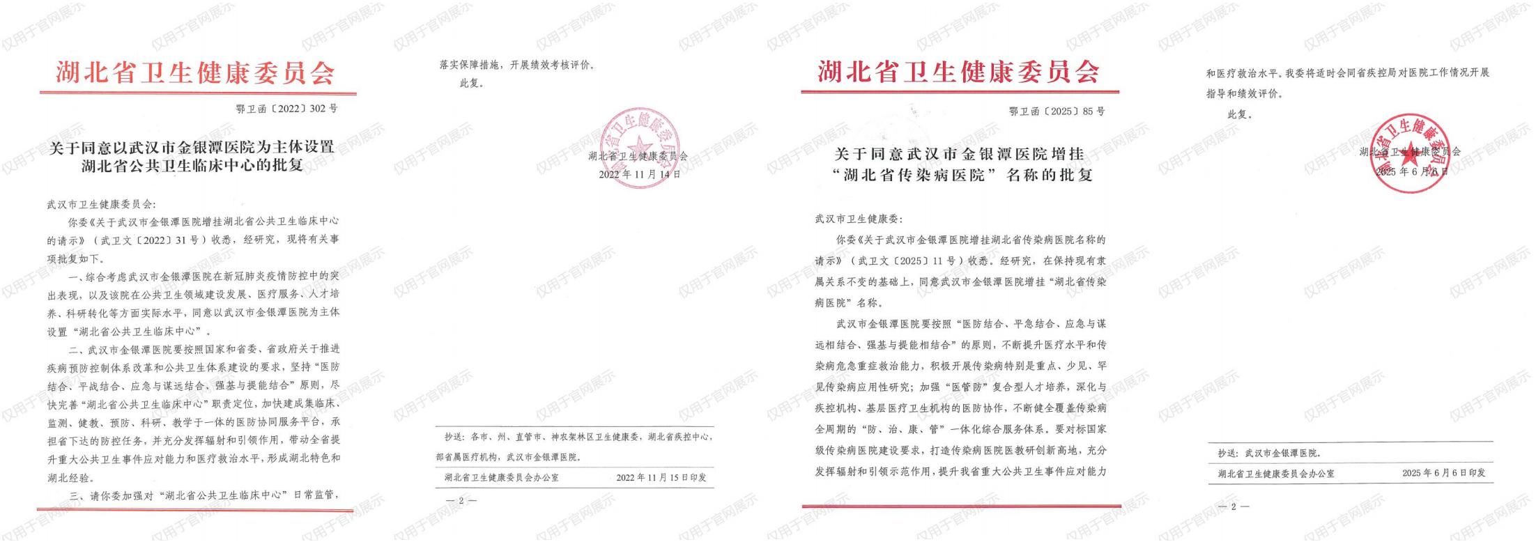 批复文件要求,武汉市金银潭医院要按照“医防结合、平急结合、应急与谋远相结合、强基与提能相结合”的原则,不断提升医疗水平和传染病危急重症救治能力,积极开展传染病特别是重点、少见、罕见传染病应用性研究;加强“医管防”复合型人才培养,深化与疾控机构、基层医疗卫生机构的医防协作,不断健全覆盖传染病全周期的“防、治、康、管”一体化综合服务体系。要对标国家级传染病医院建设要求,打造传染病医院医教研创新高地,充分发挥辐射和引领示范作用,提升湖北省重大公共卫生事件应对能力和医疗救治水平。